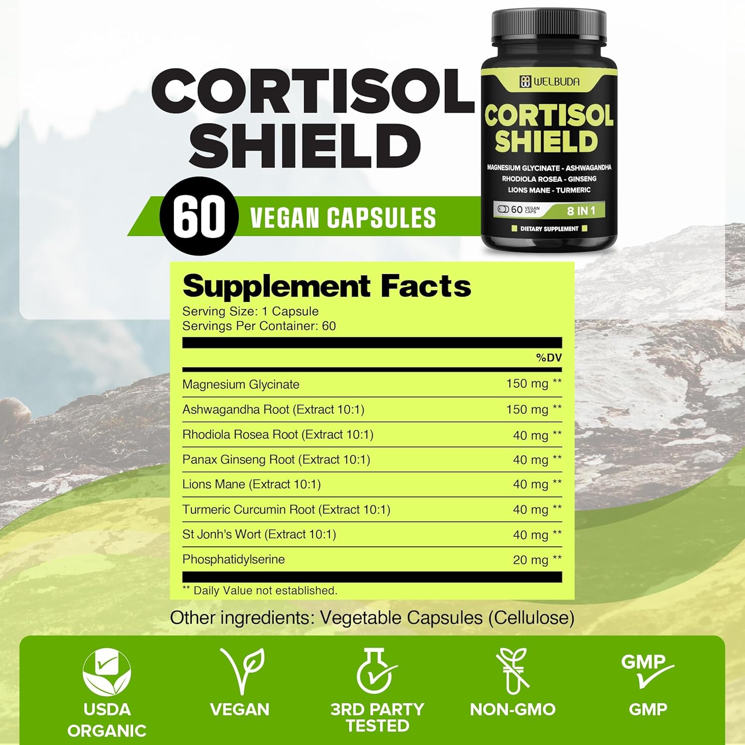 8in1 Cortisol Shield – Ashwagandha and Magnesium, Rhodiola Rosea, Lions Mane, Gingsen, and 3 More – Relaxation & Restful Night Support & Mood Balance – 60 Count