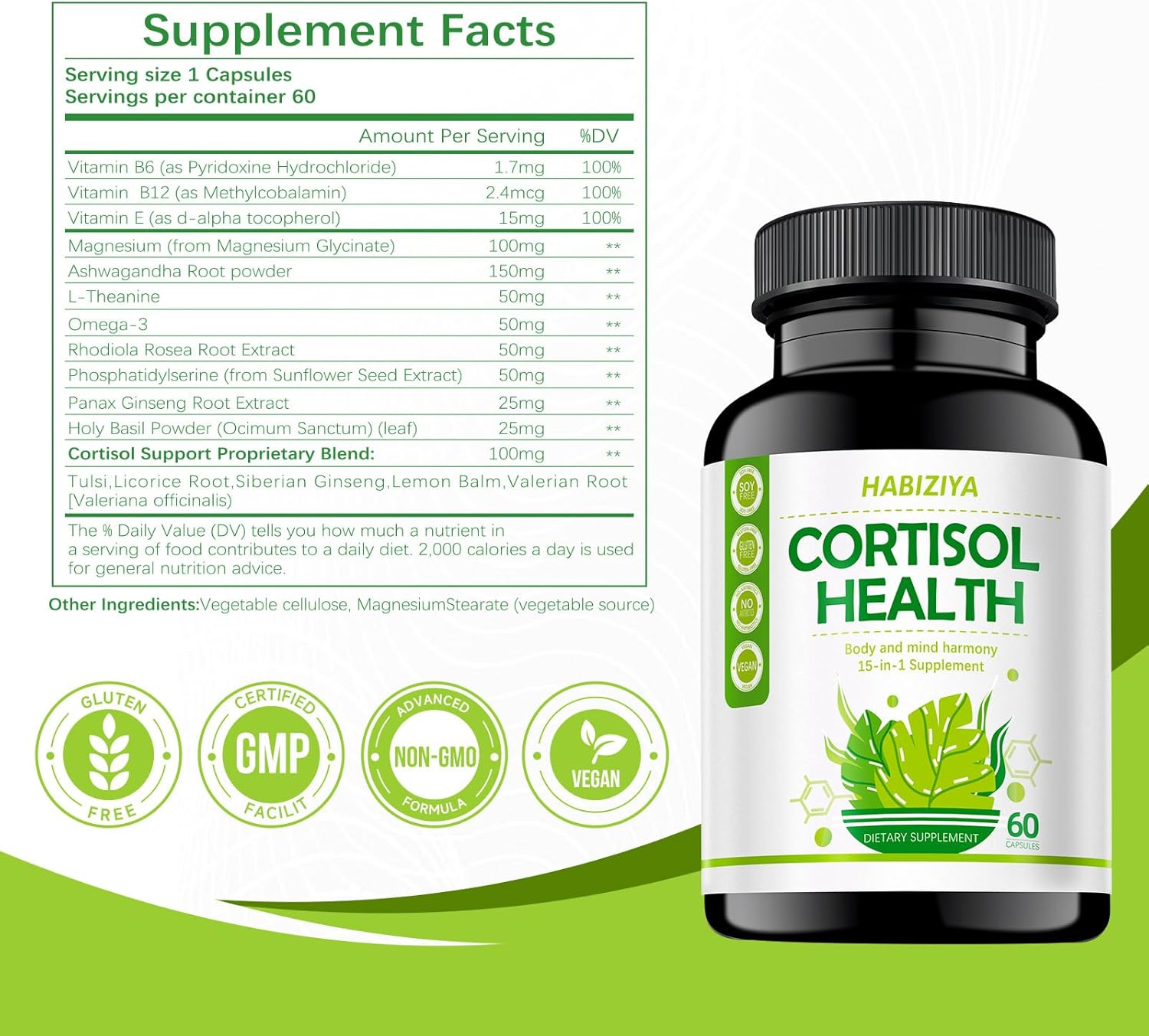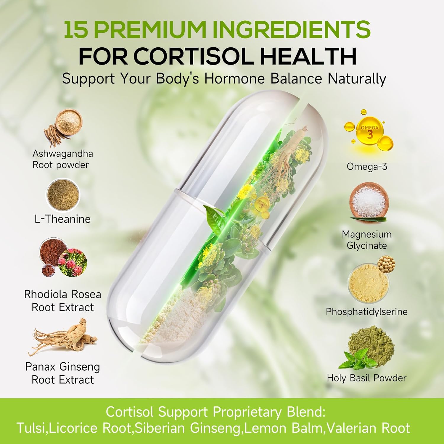 15-IN-1PREMIUM INGREDIENTS:Our Cortisol Support Supplement is formulated with a blend of natural ingredients to support your energy levels.— Ashwagandha, Rhodiola Rosea, Holy Basil, Tulsi,Licorice Root,Siberian Ginseng,Lemon Balm,Valerian Root . Support your cortisol wellness with our expertly formulated Cortisol complex.