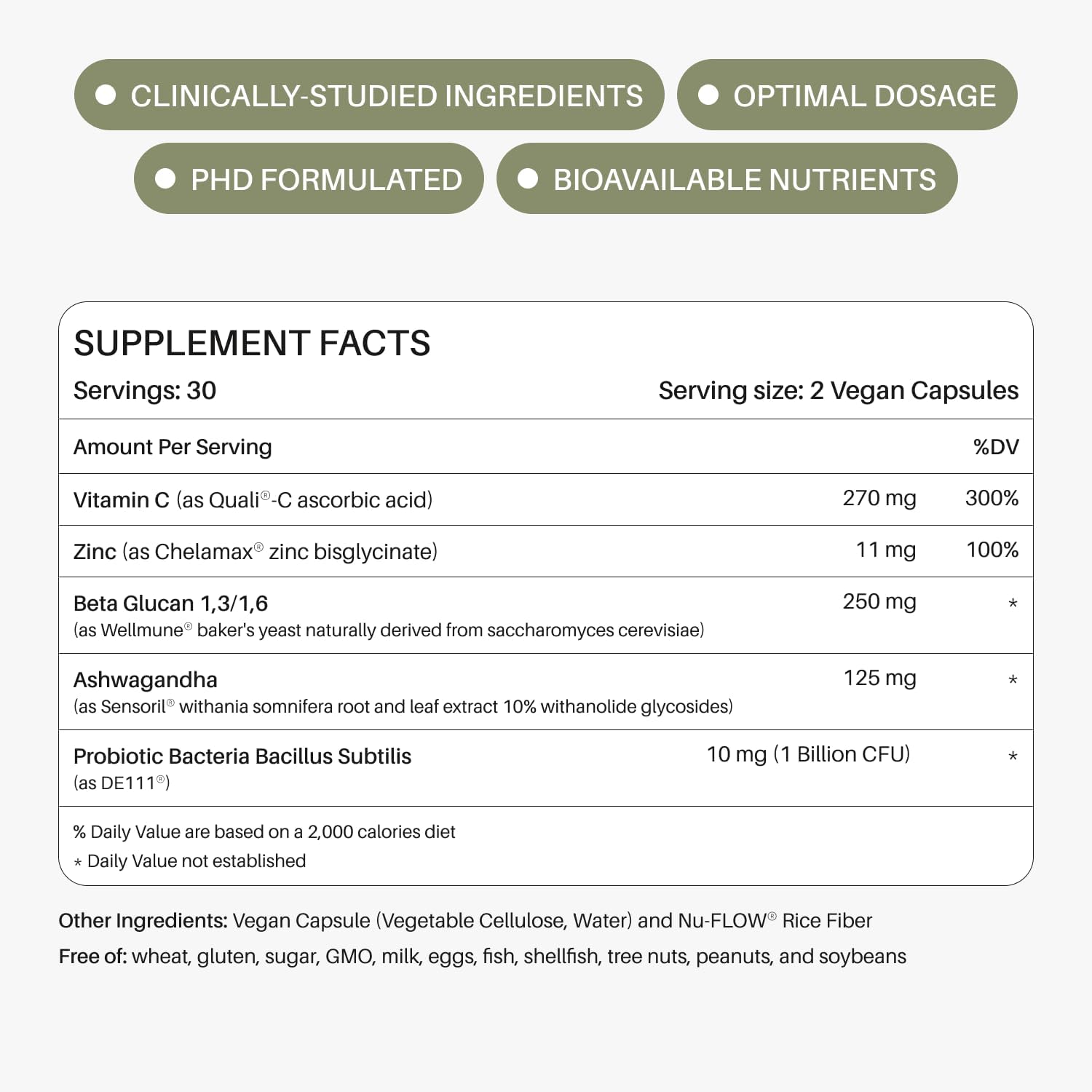 Defend Immune Support Supplement – Gut & Cortisol Balance – Spore Probiotic & Beta Glucan – DE111® Probiotic, Wellmune®, Ashwagandha & Antioxidants – Bloating, Digestion & Stress Relief – 60 Capsules