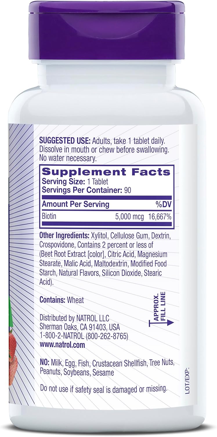 Natrol Beauty Biotin 5,000mcg Tablets make it easy to get the daily support for healthy hair, skin and nails for those low in Biotin.* Sourced from high-quality, Non-GMO ingredients, this dietary supplement contains no synthetic dyes or artificial flavors. These Biotin tablets are also 100% vegetarian, containing no milk, egg, fish, crustacean shellfish, tree nuts, peanuts, soybeans or sesame. Biotin is a water-soluble B vitamin and an important nutrient not only for hair, skin and nails but also to help convert food into energy. For those low in Biotin, this Natrol supplement offers a high amount of Biotin to support healthy hair, skin, strong nails and energy metabolism.* Natrol s fast-dissolve formula allows you to take these delicious strawberry-flavored tablets anytime, anywhere, and without water. Adults, take one fast dissolve tablet daily. Natrol is dedicated to creating innovative, quality products, to help you maintain good health and thrive in your busy, modern lifestyle.