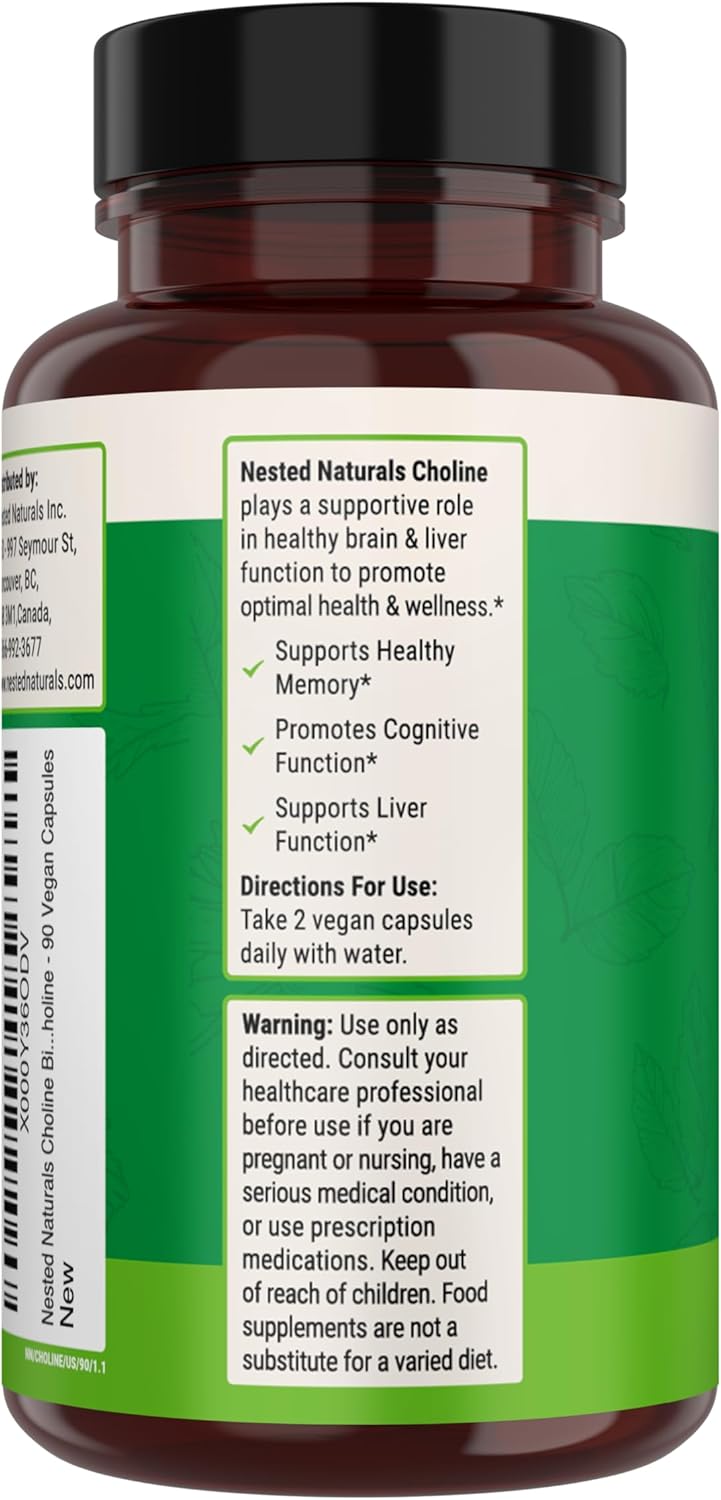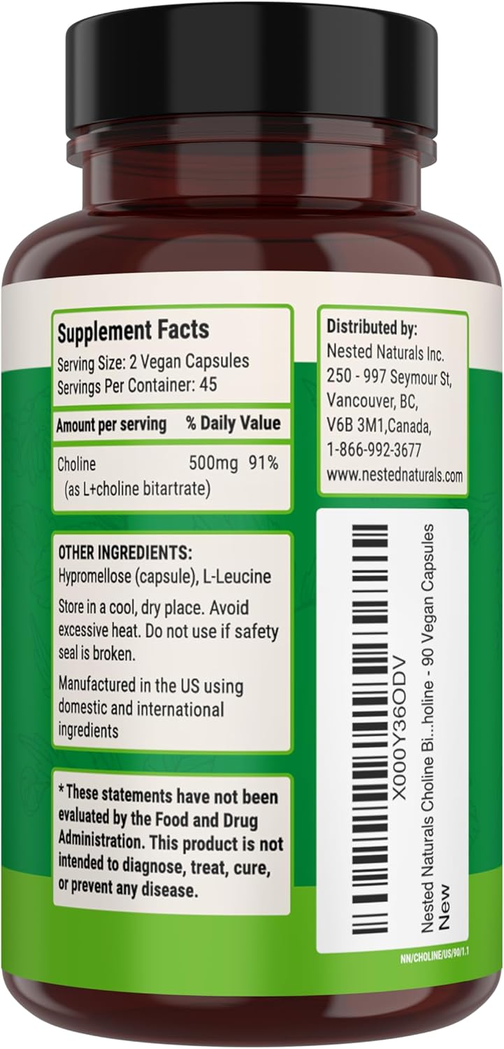Nested Naturals Choline Bitartrate 500mg – High Potency Choline Supplements – Supports Cognitive Performance & Liver Function – 100% Vegan & Non-GMO Choline – 90 Vegan Capsules